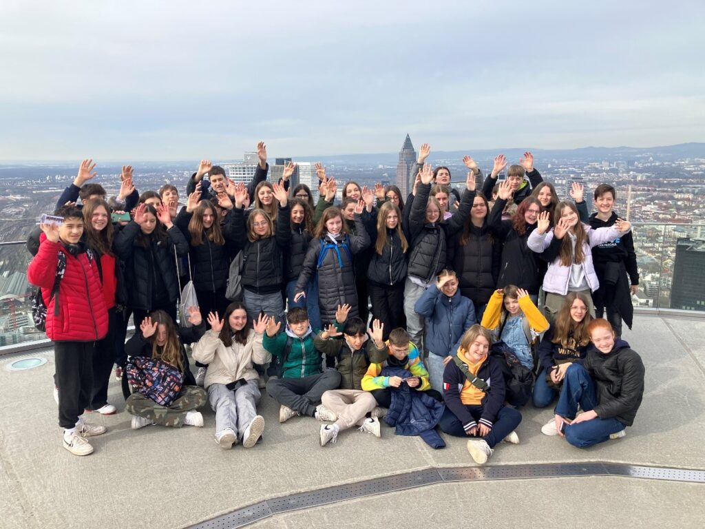Freitagmorgen ging es nach Frankfurt. Wir begannen unseren Trip auf dem Main Tower, um uns einen Überblick zu verschaffen. Die geplante Tour von der Alten Oper über die „Fressgass“ und die Zeil zum Dom, zur Paulskirche und dem Römer mussten wir stark kürzen. Trotzdem war es ein Erlebnis, in einer richtigen Großstadt gewesen zu sein. Den letzten Nachmittag verbrachten die Schüler in den Familien. Abends gab es eine große Abschiedsparty mit einem von den Eltern gestellten Buffet, einem Live-Act mit Klavier und Gesang von Schülerseite sowie eine richtige Disco, organisiert von der Technik-AG der Schule.