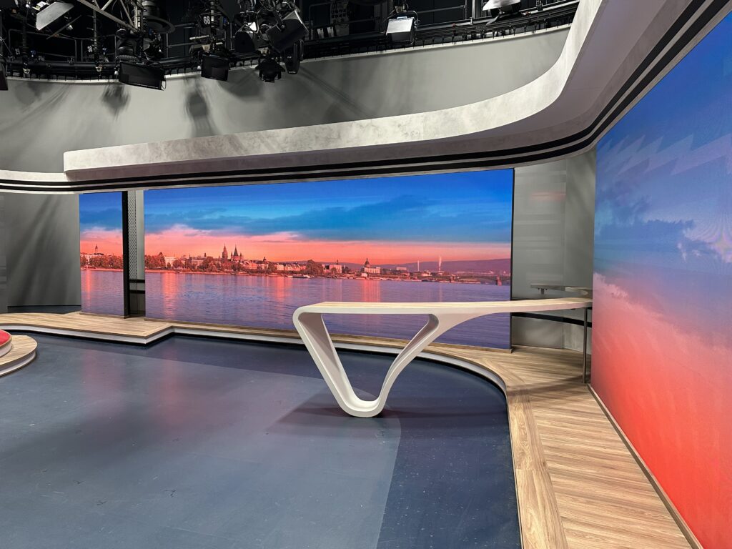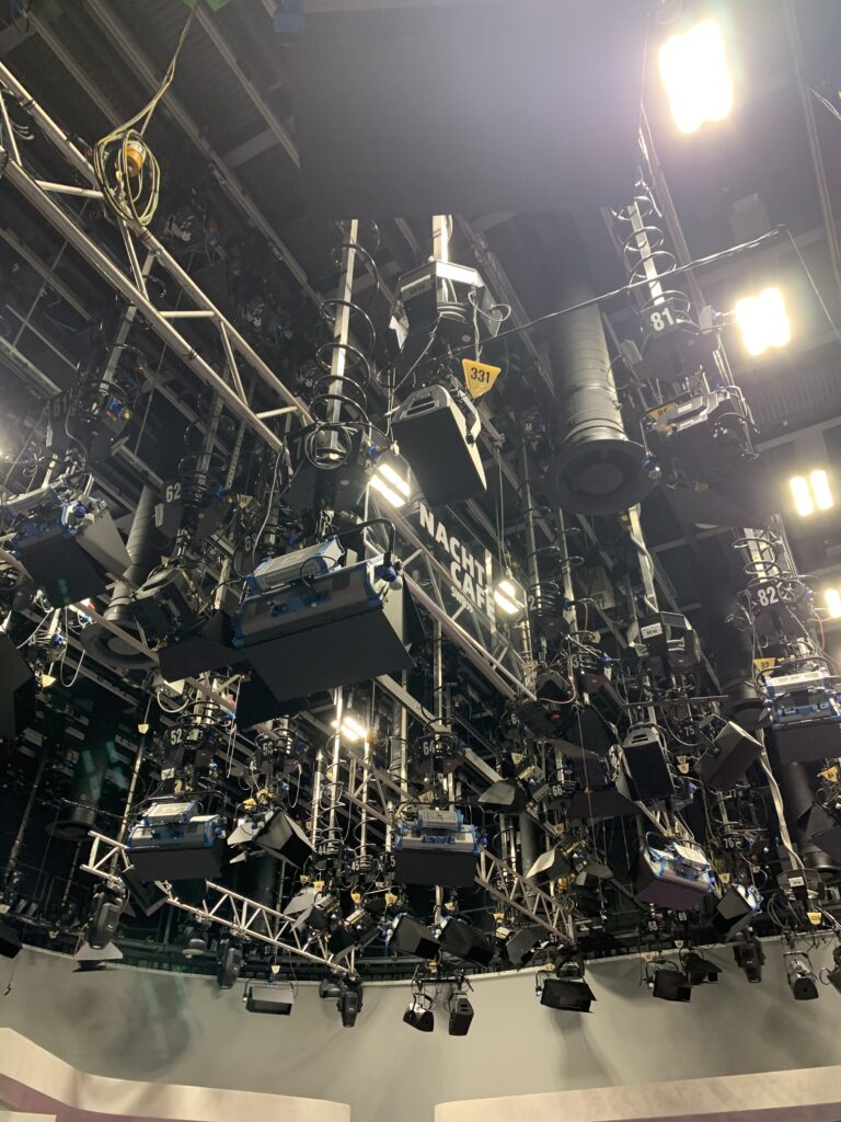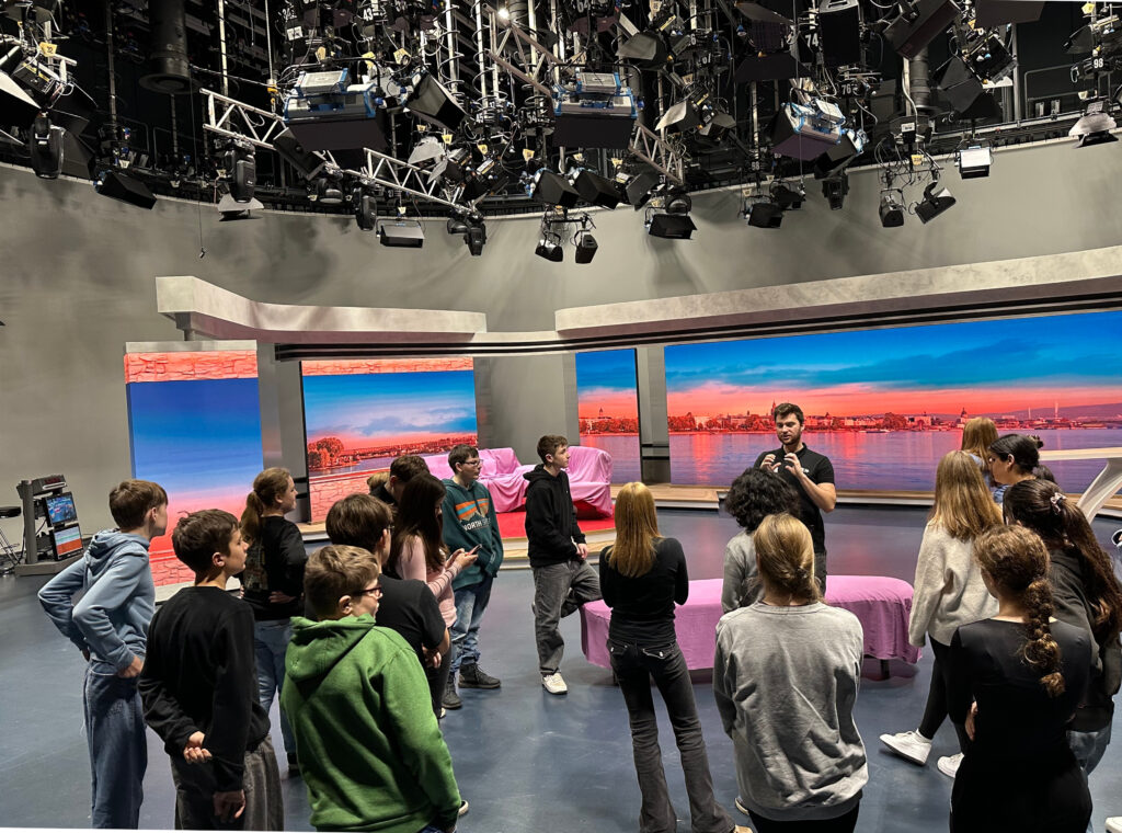 Im Fernsehstudio der Landesschau Rheinland-Pfalz bewunderten die Jugendlichen die typischen roten Studiomöbel, das Mainzer Panorama im Hintergrund und die mehr als 130 Scheinwerfer an der Decke, die für perfektes Licht sorgen. Eine professionelle Studiokamera im Wert von rund 250.000 Euro, die Herr Filtzinger vorführte und dabei die Funktionsweise eines Teleprompters erläuterte, beeindruckte die jungen Besucherinnen und Besucher besonders. Im Regieraum staunten sie über dutzende Monitore und die unzähligen leuchtenden Tasten der Mischpulte und anderen Steuerungsgeräte. Die Schülerinnen und Schüler erhielten einen Einblick in die Bedienung der Geräte und erfuhren, dass die Aufgabenbereiche im Regieraum klar getrennt sind. Dabei wurde deutlich, dass man beim Fernsehen offensichtlich eine Vorliebe für Abkürzungen hat, was die Begriffe „Bimi“ für „Bildmischer“, „CVD“ für „Chef vom Dienst“ oder „VR“ für „verantwortlicher Redakteur“ zeigen.