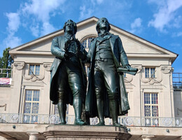 Für gewöhnlich begegnen junge Menschen den Geistesgrößen Goethe und Schiller in der Schule auf eher theoretische Weise – doch Ende August 2025 konnten die Deutsch-Leistungskurse des Jahrgangs 12 im Rahmen einer Studienfahrt nach Weimar ganz lebensnah mit ihnen auf Tuchfühlung gehen. Unter der Leitung von Kathrin Dejung und Mirjam Heider – als vertretende Lehrkraft für die Leiterin des zweiten LK Deutsch, Natalie Grams – erkundeten die Schülerinnen und Schüler in der thüringischen Kleinstadt Höhen und Tiefen deutscher (Kultur-) Geschichte.
