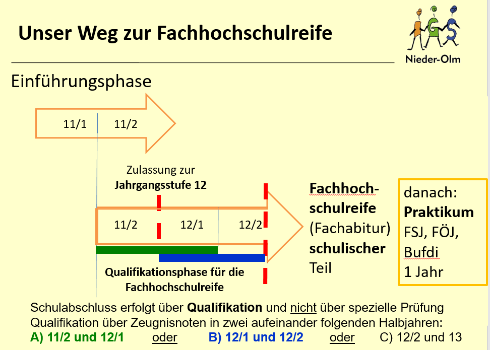 Nach dem schulischen Teil erfolgt ein praktisches Jahr, eine Ausbildung o.ä. Erst danach besitzt man die vollständige Fachhochschulreife, die zum Studium an den Hochschulen des Landes berechtigt. Die jeweiligen Hochschulen informieren über die Anerkennung des praktischen Jahres für die gewünschten Studiengänge. Alle Infos zu den Qualifikationsbedingungen enthält die Seite zur Fachhochschulreife des Bildungsministeriums.
