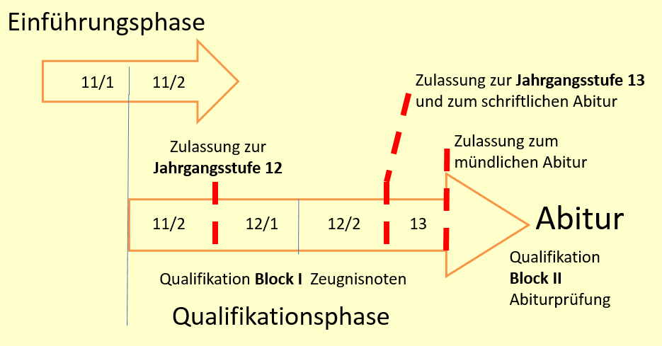 Nach einer halbjährlichen Einführungsphase (11/1) beginnt mit dem zweiten Halbjahr in der Jahrgangsstufe 11 die Qualifikationsphase für das Abitur. Die Endnoten aus vier Qualifikationshalbjahren (11/2, 12/1, 12/2 und 13) werden in die Berechnung der Abiturnote eingebracht. Diese bilden zwei Drittel der Abschlussnote. Das andere Drittel wird durch die Abiturprüfung im Januar (schriftlich) bzw. im März (mündlich) der Jahrgangsstufe 13 ermittelt. Alle Infos zu den Qualifikationsbedingungen enthält die Webseite zur gymnasialen Oberstufe in Rheinland-Pfalz des Bildungsministeriums.